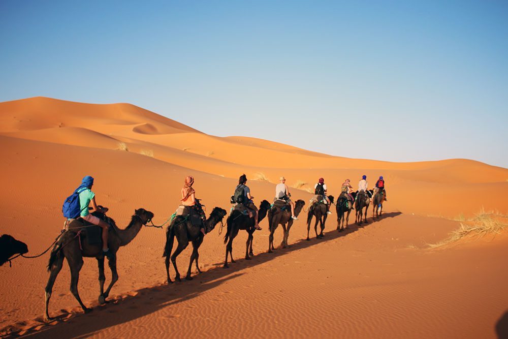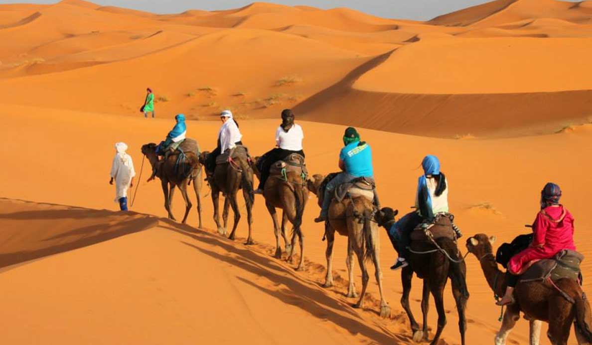 Early departure from you accommodation in Fes for an explorative tour from Fes to Marrakech through the desert sahara of Merzouga. In this tour you will discover explore the deep culture of Berbers in the south east of Morocco. The tour starts from fes to Ifrance the small Switzerland of Morocco. After a short visit for the city, we will continue to the cedar forest in Azrou, where you will meet the Barbary monkeys (apps) in the forest, you will buy something to feed them in order to take some beautiful pictures. Crossing the mountain range of the Middle Atlas Along the Ziz valley we will have the opportunity to take some photos for the second biggest palm grove in Morocco, settled over 150KM. Stop for lunch in a local restaurant; then we will continue to Erg Chebbi dunes in the small village of Merzouga. Arrival at the hotel, you will be welcomed by a mint tea and check in to your hotel to change your cloths to start another adventure but this time not with car but with camels. You will ride your camels to cross the dunes and discover the secret of the sea of sand; our stop will be on the tp of the big dunes of Erg Chebbi to enjoy the silence of the desert, the beauty of nature and watch the sunset. Dinner and overnight in a Berber tent at the foot of one of the highest dunes of Erg Chebbi.